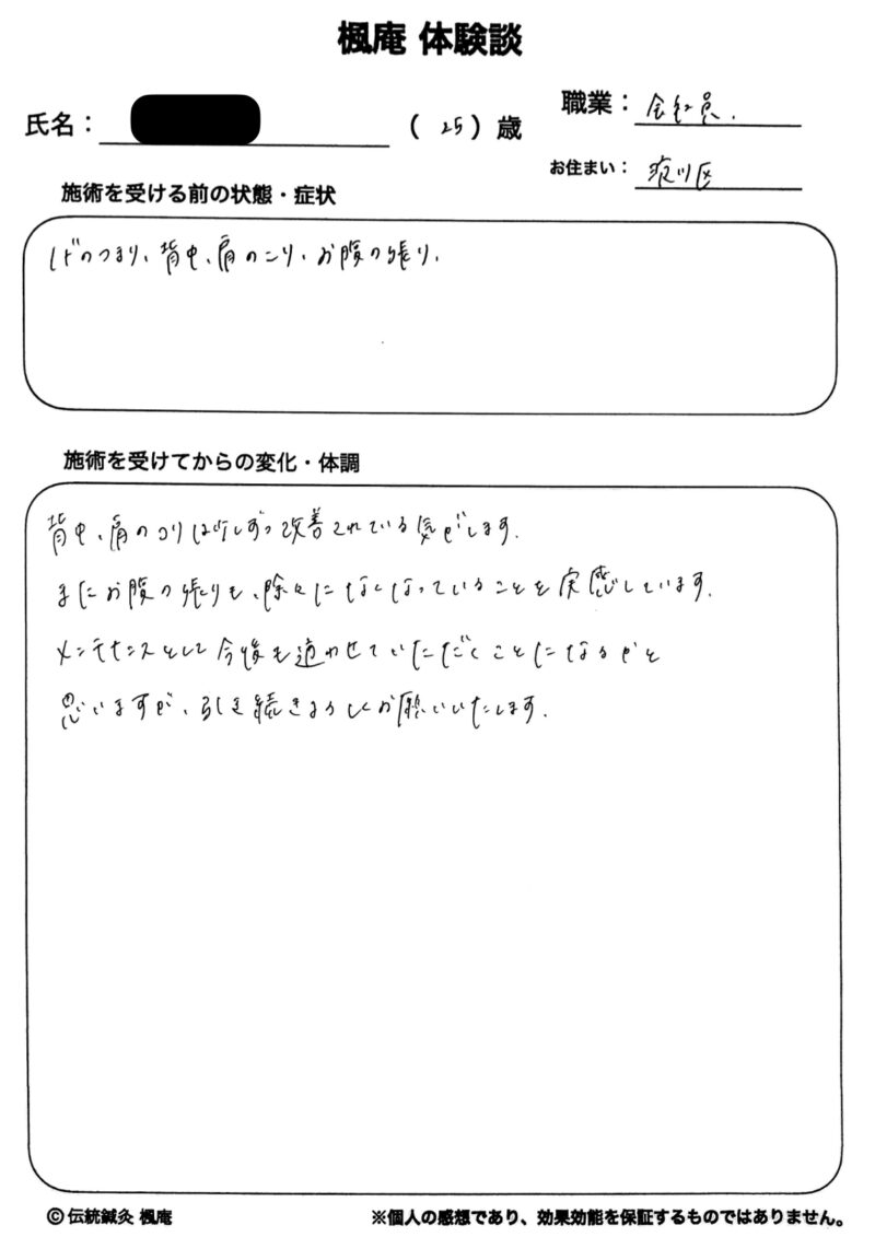 咽のつまり・背中〜肩のこり・腹部の張りでお悩みの こちらでは楓庵での施術体験談を御紹介致します。※体験談の内容は個人の感想であり、効果効能を証明するものではありません。咽のつまり・背中〜肩のこり・腹部の張り:大阪市淀川区のR.Sさん【施術を受ける前の状態[…]