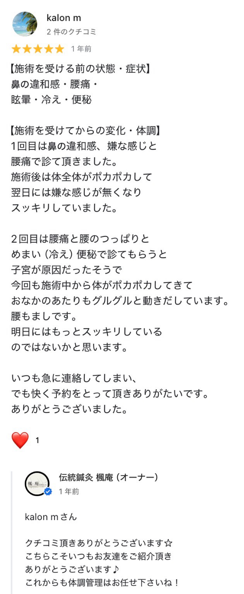 施術中から体がポカポカしていた。